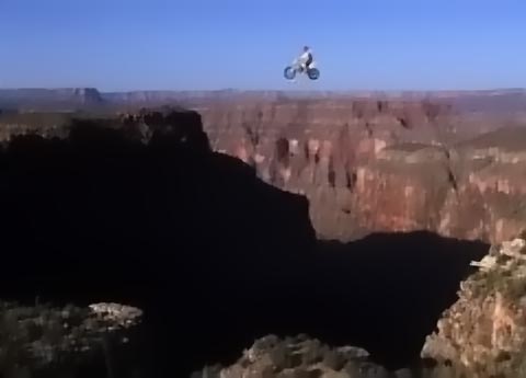 On May 20th Robbie Knievel made his greatest jump ever, across the Grand Canyon. He cleared the Canyon while setting a new Motorcycle jump distance record of 228 feet. The Stunt was almost perfect! He had great speed, the takeoff was superb and there were no difficulties with the crosswinds during the flight. Robbie set his motorcycle about half way down on the landing ramp and appeared to have everything under control. But when he left the ramp and got onto the desert floor, he lost control while trying to negotiate the rugged terrain. He was then separated from his motorcycle as they both rolled into a hay bale before coming to a stop. Robbie was shaken up, but managed to make it to his feet and address the crowd. He was taken to a hospital in LA where x-rays revealed 2 broken ribs and a very badly sprained ankle. He was released from the hospital later that night and is fine.